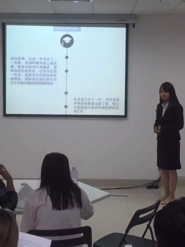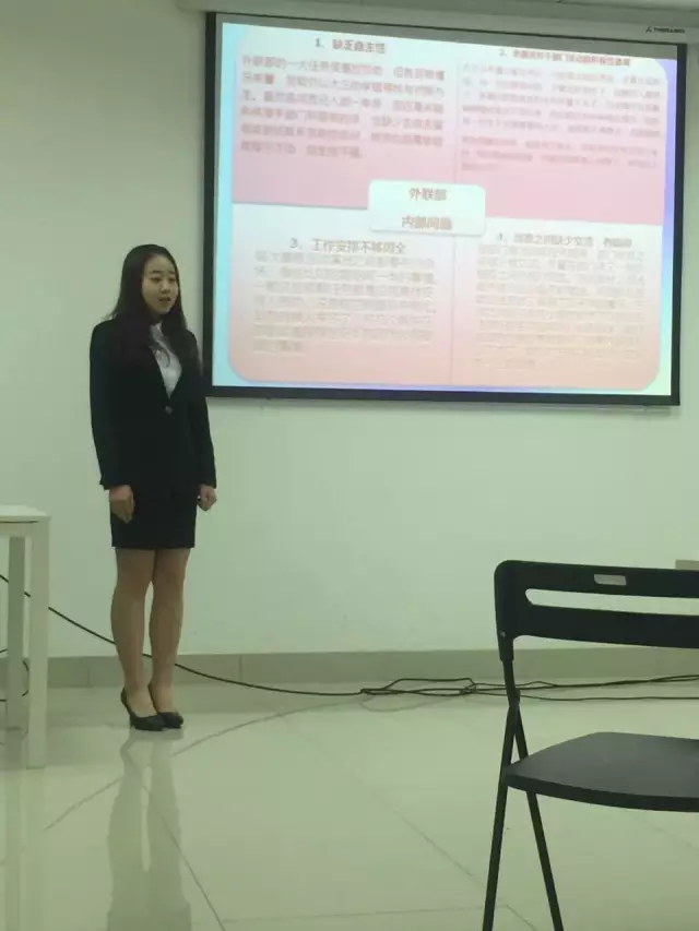 各位竞选者通过精心制作的PPT,向面试官展示了自己的经历与竞选优势,也指出了各个部门团队目前的瑕疵之处,并且对这些现存的问题给予了自己设想的解决方案。