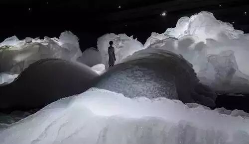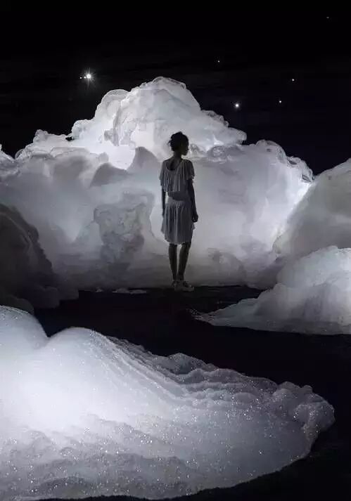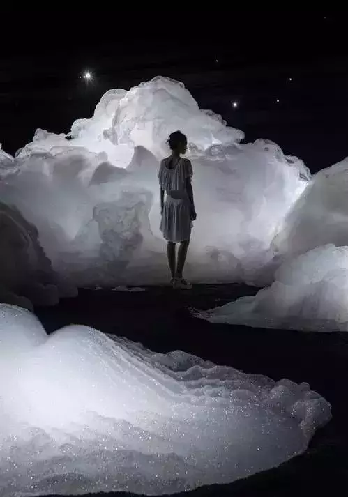 京都艺术家名和晃平创造了巨大的装置制成云状小气泡,坐落在一个黑暗房间里,由浮沫积聚,形成一个空灵结构跨空间传播。