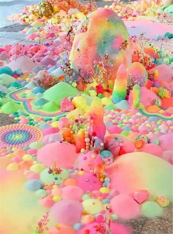 澳洲艺术家Tanya Schultz用数以千计的糖果,搭配上百公斤的细砂糖、泡沫胶、亮粉、颜料及许多色彩缤纷的装饰小物,打造出一个梦幻无比的Sugerland。从远古神话、通俗的童话到现代的电玩游戏通通都是Tanya的灵感来源,而一向怀抱着乌托邦理想的艺术家也透过不断的创作将心中的梦想呈现在世人眼前。