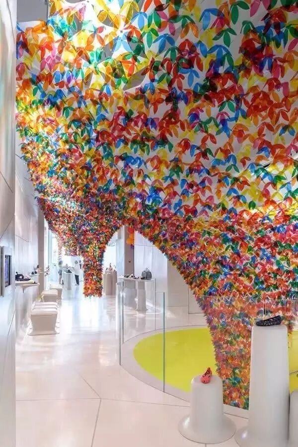 在纽约Galeria Melissa旗舰店里,我们可以看到一个非常唯美的五颜六色的花瓣艺术装置悬挂于天花板上,超过20000个半透明的五彩花瓣艺术装置来自于SOFTlab的设计,酷似花朵的自然覆盖于天花板上,仿佛置身于空中花园般,欢乐的色彩更是让人痴迷。