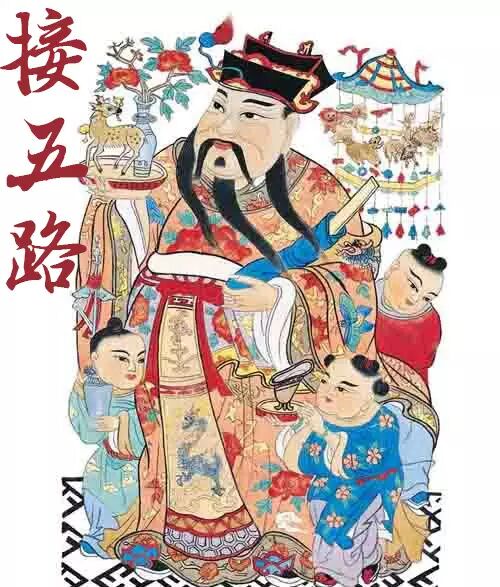 接五路,本指接五路行神,后来演变成接五路财神。旧时商家春节休假后,一般都在初四晚上接请五路财神,初五开市,以图吉利。初四日下午三点,接五路仪式的准备工作就开始了,直到晚上九、十点钟结束。头桌是果品如广橘、甘蔗,寓意财路广阔,生活甜蜜;二桌是糕点,寓意高升、常青;三桌为正席,供全猪、全鸡、全鱼,并元宝汤等。半桌是饭、面、菜,一碗路头饭中插一根大葱,葱管内插一株千年红,寓意兴冲冲、年年红。大家满怀发财的希望,但愿财神爷能把金银财宝带来家里,在新的一年里大发大富。