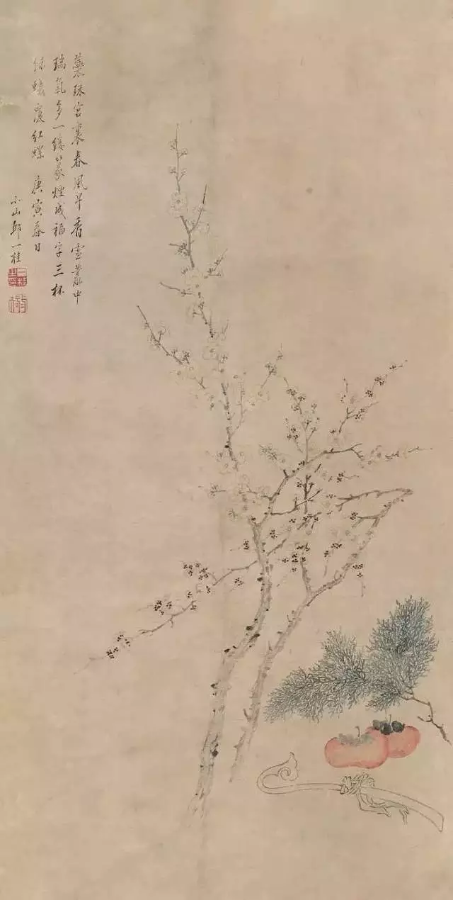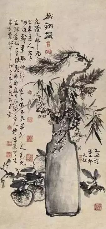 对于文人画家们来说,虽然现实生活中的春节岁朝也是喧闹喜庆,充满了人间烟火,但是在他们笔下却仍然可以含蓄优雅,诗情画意。古器、花果,甚至是卷轴书画、金石拓片,一切可资雅玩的物品都可以作为岁朝清供入画。如同汪曾祺看到过的一幅古画:一间茅屋,一个老者手捧一只瓦罐,内插梅花一枝,正要放到案上,题字是“山家除夕无他事,插了梅花便过年”。