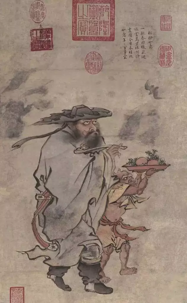 以钟馗为描绘对象,可看作是祈福的宫廷年画,画中钟馗盯着飞来的蝙蝠(意为福来),小鬼双手捧盛有柿子和柏枝的托盘,意为“百事如意”。