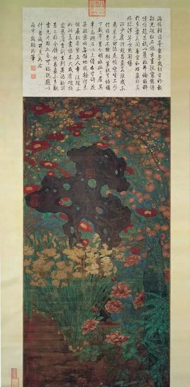 此画著录于《石渠宝笈续编》,中间绘一块奇石,周围以水仙、梅花、牡丹、茶花等穿插点缀,用色明艳,富丽堂皇,极具装饰效果。至清末民初,这种创作达到鼎盛期,例如清代扬州画派中的李鱓、罗聘、高凤翰等人皆有岁朝清供类的作品传世,蕴含了文人画的趣味。