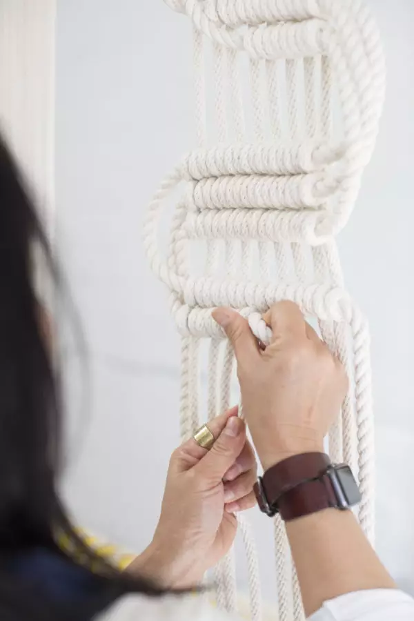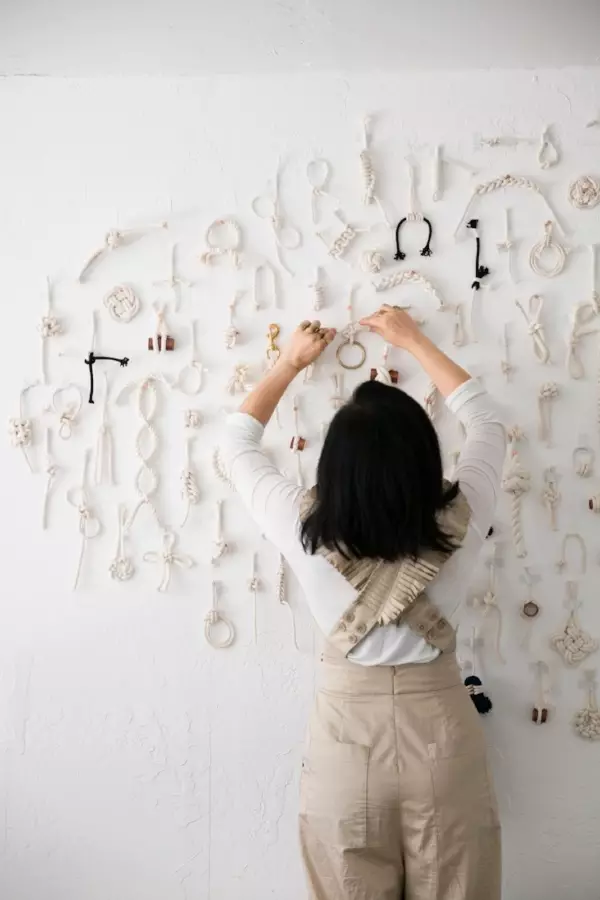 而Windy Chien手中的绳,去除了“生存”和“实用”的意义,只是用来让日常生活增加了仪式感和新的价值,Windy喜欢打结,每天早上起来的第一件事,就是用打一种之前没有打过的结来开启新的一天,她说,这事每天保持着做,就很有仪式感,每天都知道要做一件固定的事,就像每天早上浇花一样,是一个既定的“小事情”,这样的小事情,日复一日地发生,每天却又会有一点不同,创造出了一点点小小的新事物,那种感觉,让她感到非常安宁。