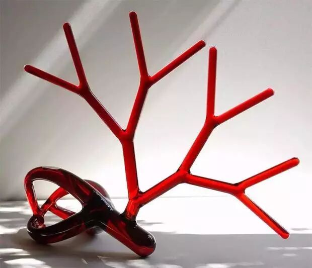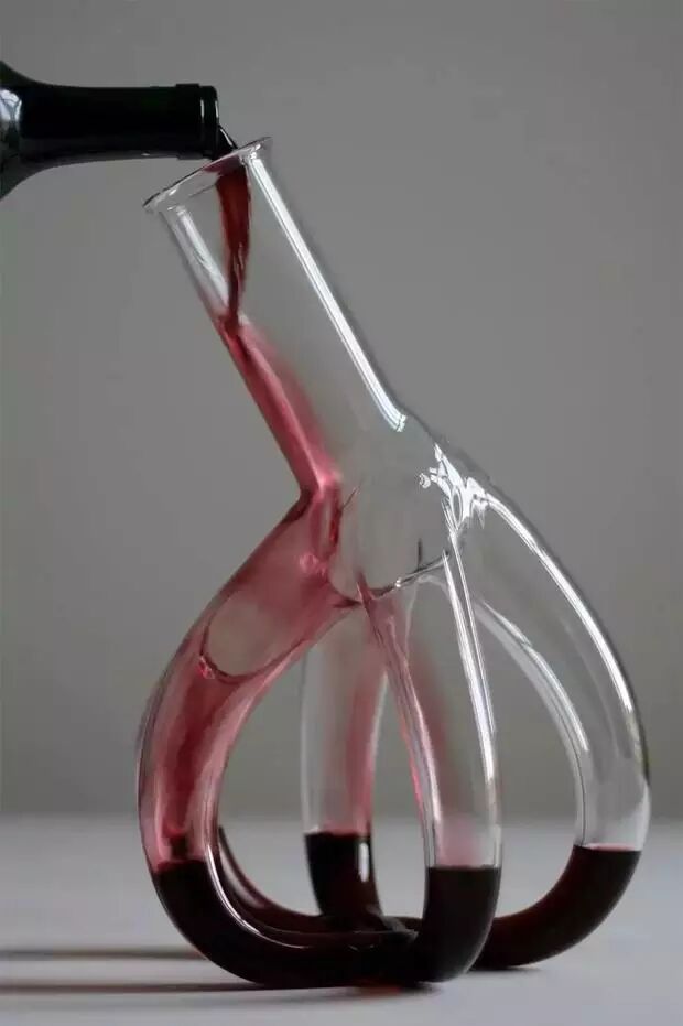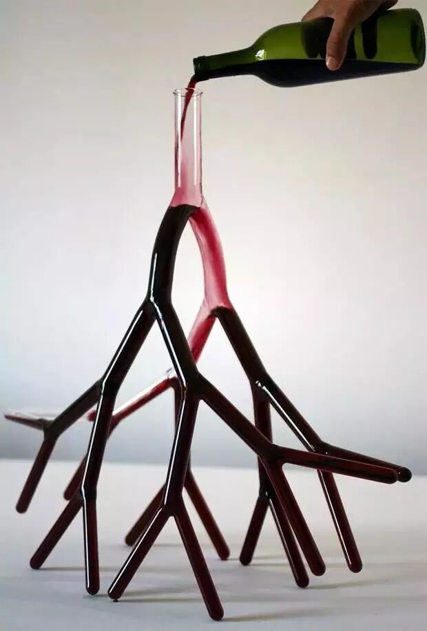 这系列葡萄酒瓶室友法国艺术家Etienne Meneau用玻璃人工吹制的,名为“Strange Carafes(玻璃水瓶)”,形状有静脉血管形、树枝形和心形。