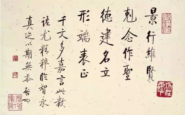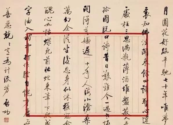 启功先生认为一字之重心并不是一点而是四点,他曾说:“将一个大方格纵横各画十三小方格,中间三小格纵横成十字路,每行小格为五三五。自左上一交叉点言,其上左俱为五,其下其右俱为八。此十字路中四交叉点,各为五比八之位置,合乎黄金分割之理”。