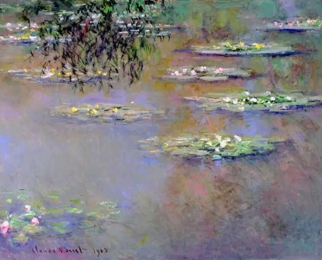 晚年的莫奈几乎足不出户,他常把画架支在水边。那时的莫奈凌晨三点起床,一连几个小时坐在睡莲池畔,与大自然心灵交融,捕捉不同季节、不同气候甚至一天的不同时刻里,花与水在光的闪烁和风的流动中,变换颤动的瞬时效果,把这种稍纵即逝的印象复述到画布上。