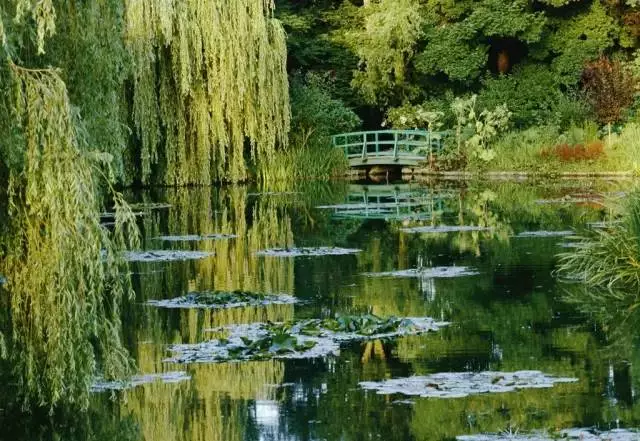 莫奈花园分为陆园和水园。1893 年,莫奈又买下邻近的一块土地,挖了一个池塘,引入吉维尼小镇附近的河水,种植了大片睡莲,并搭建了一座日式的拱形木桥。
