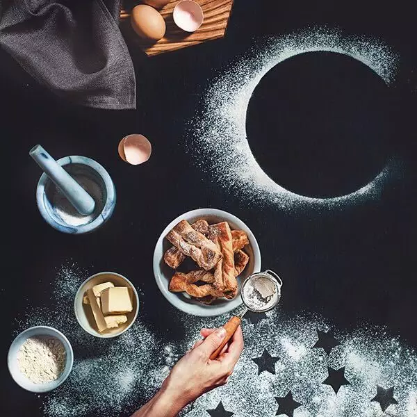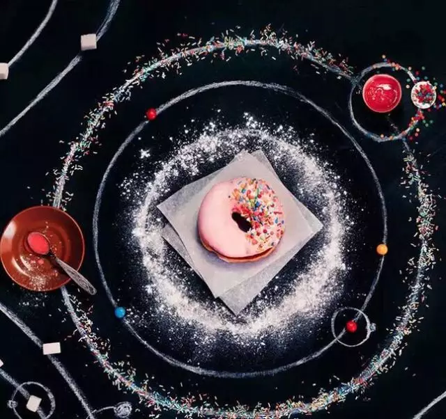 看似在这一年间,Dina Belenko与宇宙结下了不解之缘。而这次,她的创意比过去更为疯狂。可爱的草莓甜甜圈仿佛被环形带围绕的土星,黑白巧克力跃然在棋盘之上。