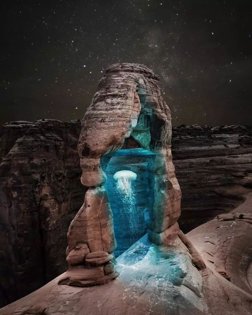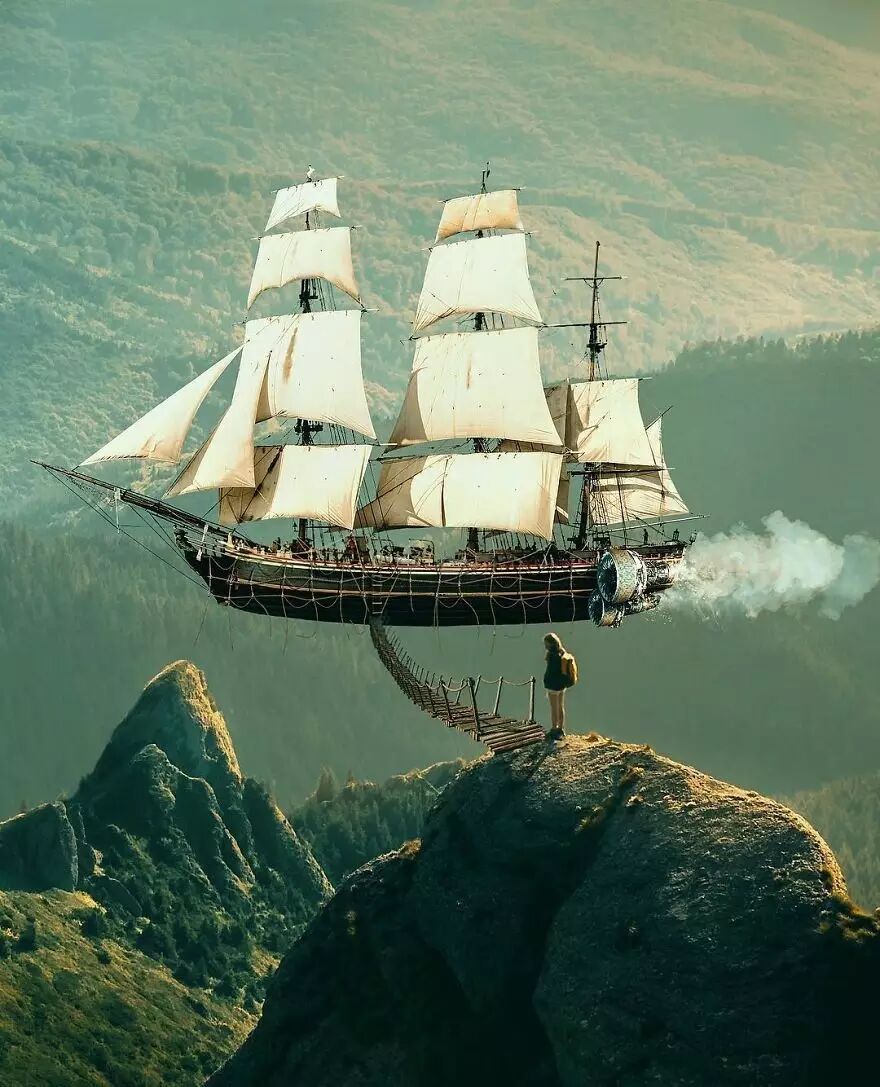 这些层次繁多的合成摄影作品是 Şahin 经过多次实践产生的结果,他独特的合成方式拓宽了人类想象力的边界,让普通的风景化作最天马行空的梦境,或是最可怕的梦魇。