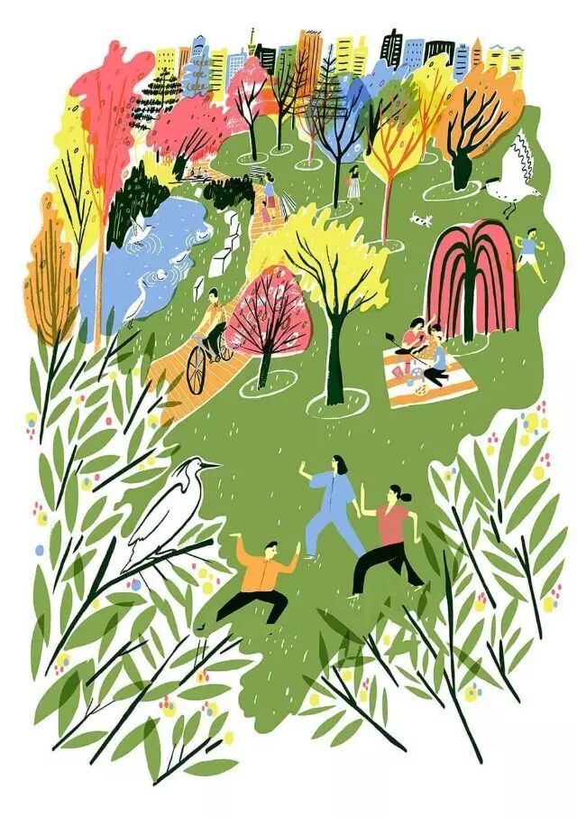 观察力敏锐的Hannah Warren,细腻地画出路人们散步遛狗、打水瓢、听音乐慢跑与在树荫下阅读等情景。