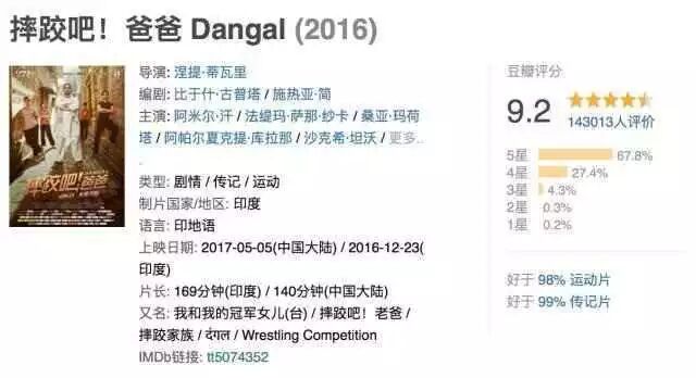 自从上映以来,《摔跤吧!爸爸》以炸裂的口碑迅速刷爆了朋友圈,在排片量不高还和《银河护卫队2》正面交锋的情况下,这部印度电影依然以高分胜出。